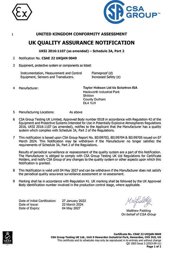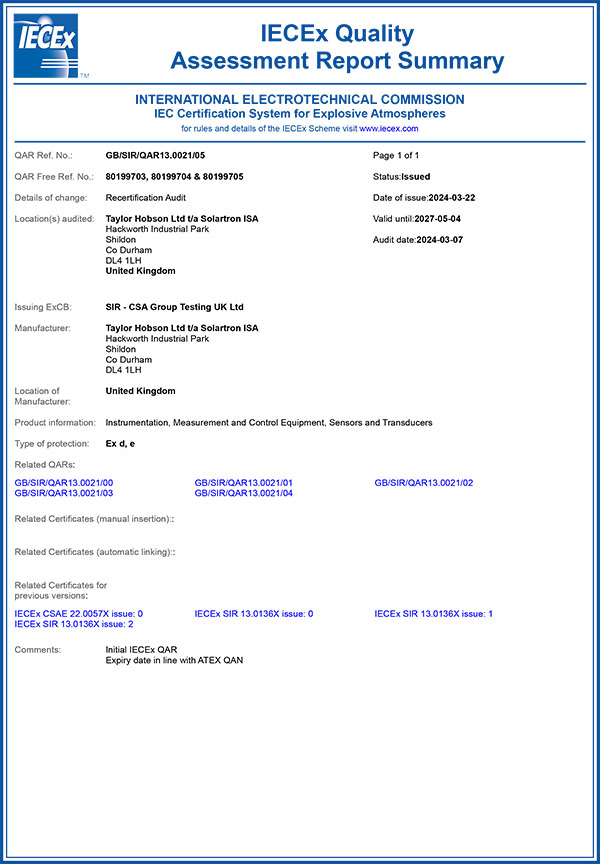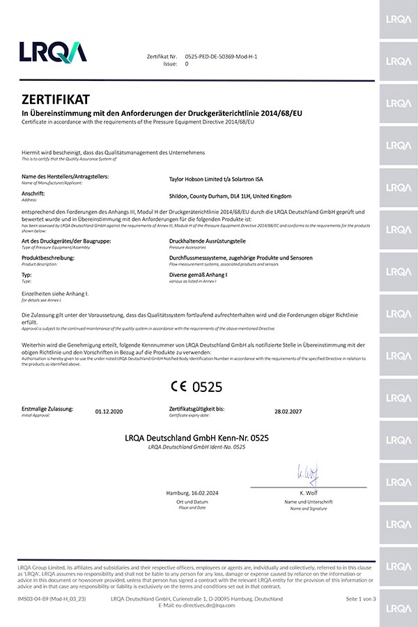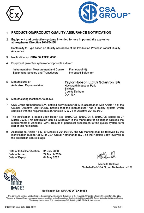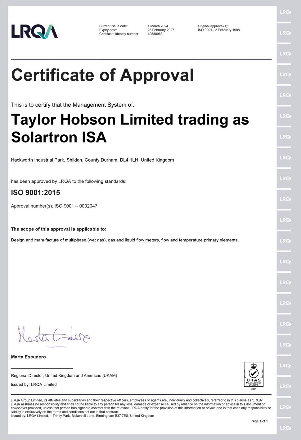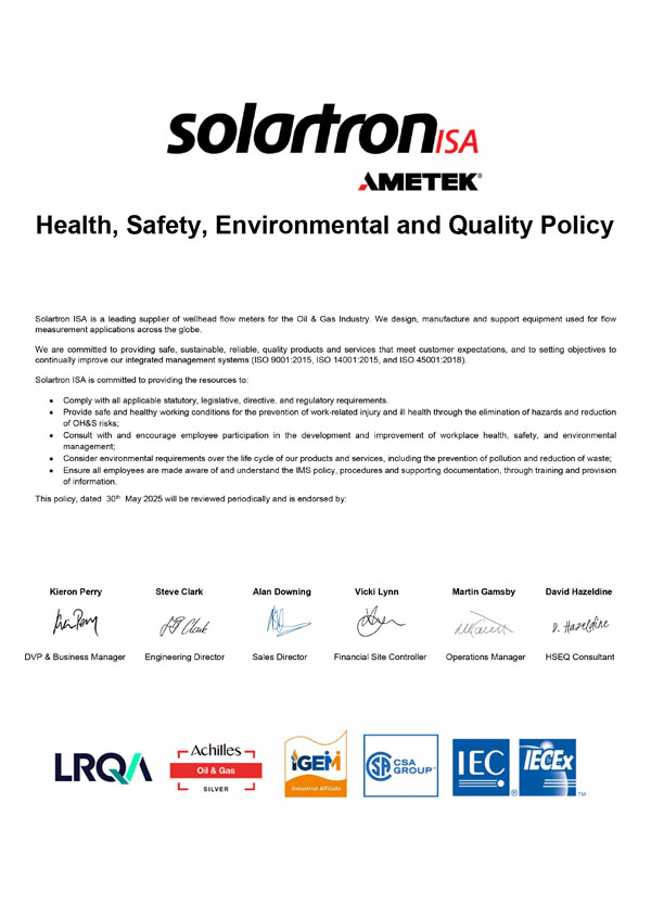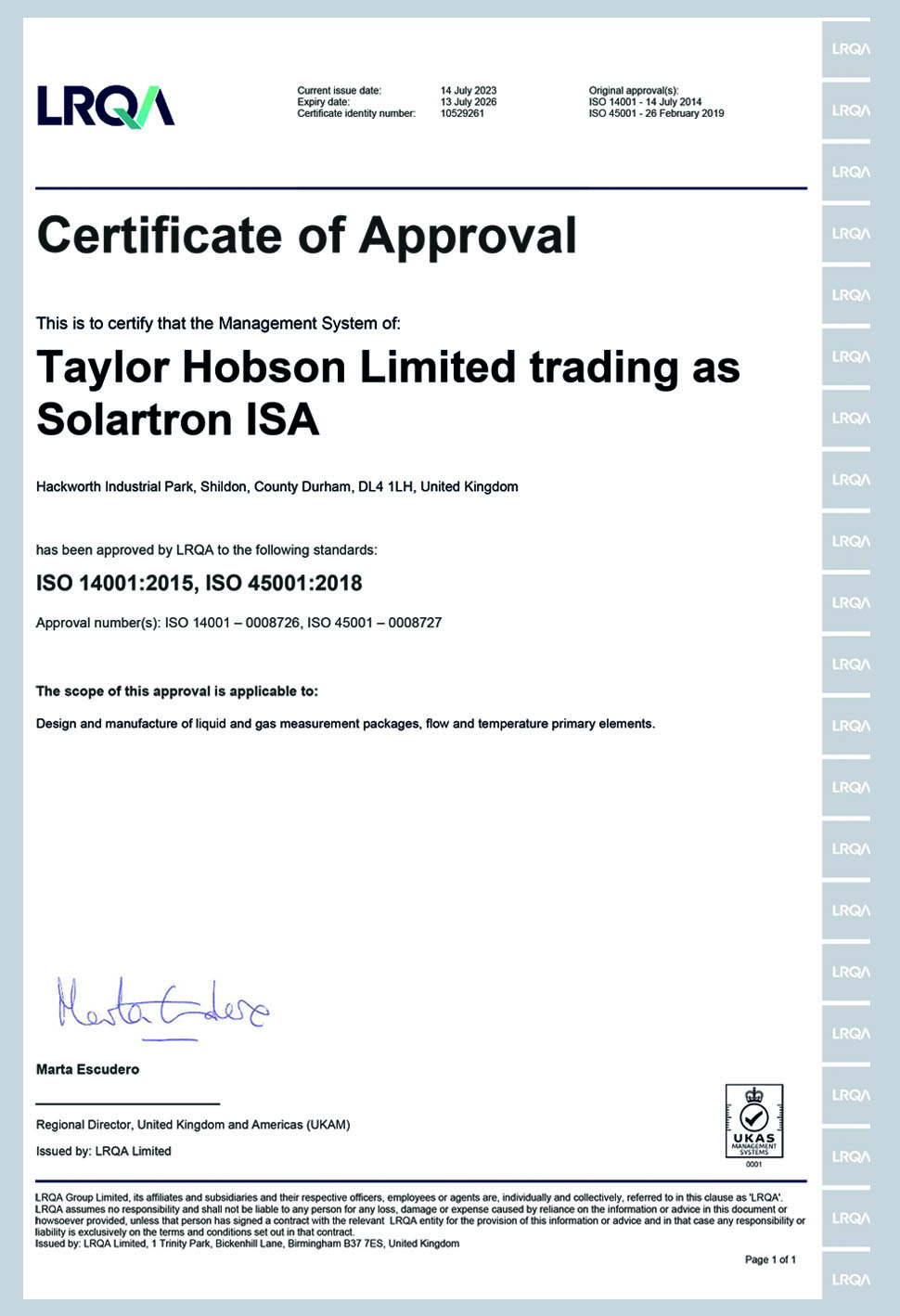As a company operating on a global platform, it is essential that we perform our business activities in a safe and professional manner. Solartron ISA operate a Safety, Health & Environmental Management system that is LRQA certificated in meeting the requirements of ISO 45001 for health and safety management and ISO 14001 for Environmental Management. We set business objectives and targets to continually improve our SHE performance each year. The members of the management team are personally committed to achieving our safety, health and environmental objectives. Click on the below logos and links to view certificates.